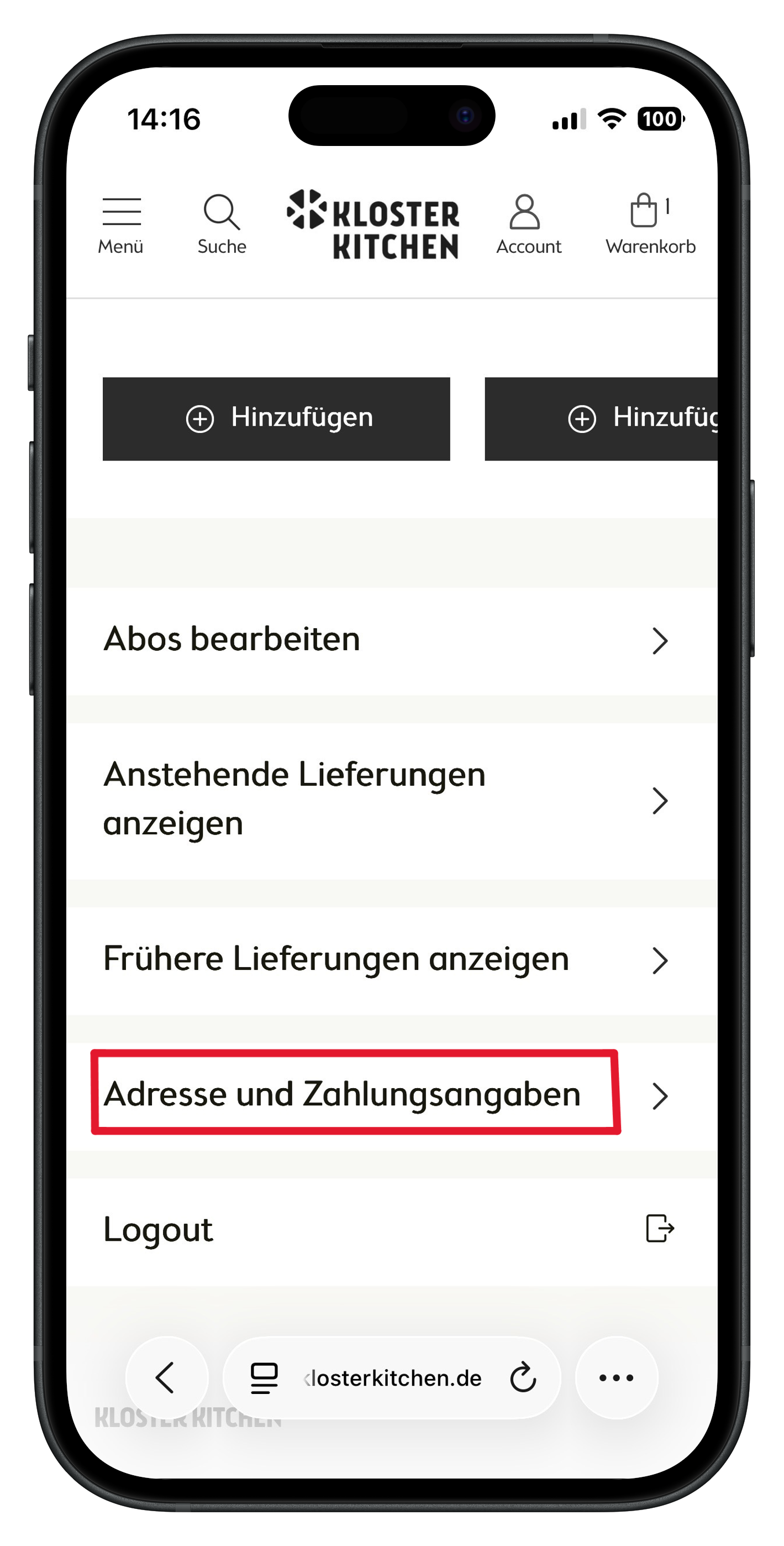 Im nächsten Schritt scrollst du bis du zu "Adresse und Zahlungsangaben" siehst.