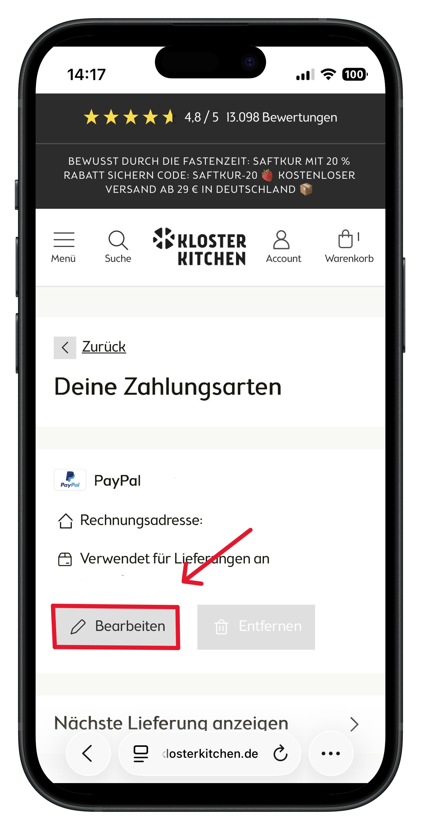 Nach dem nächsten Klick öffnet sich dann eine weitere Abzweigung klicke jetzt auf "Zahlungsarten verwalten". Jetzt nur noch auf "Bearbeiten" klicken und schon hast du deine Zahlungsart angepasst.