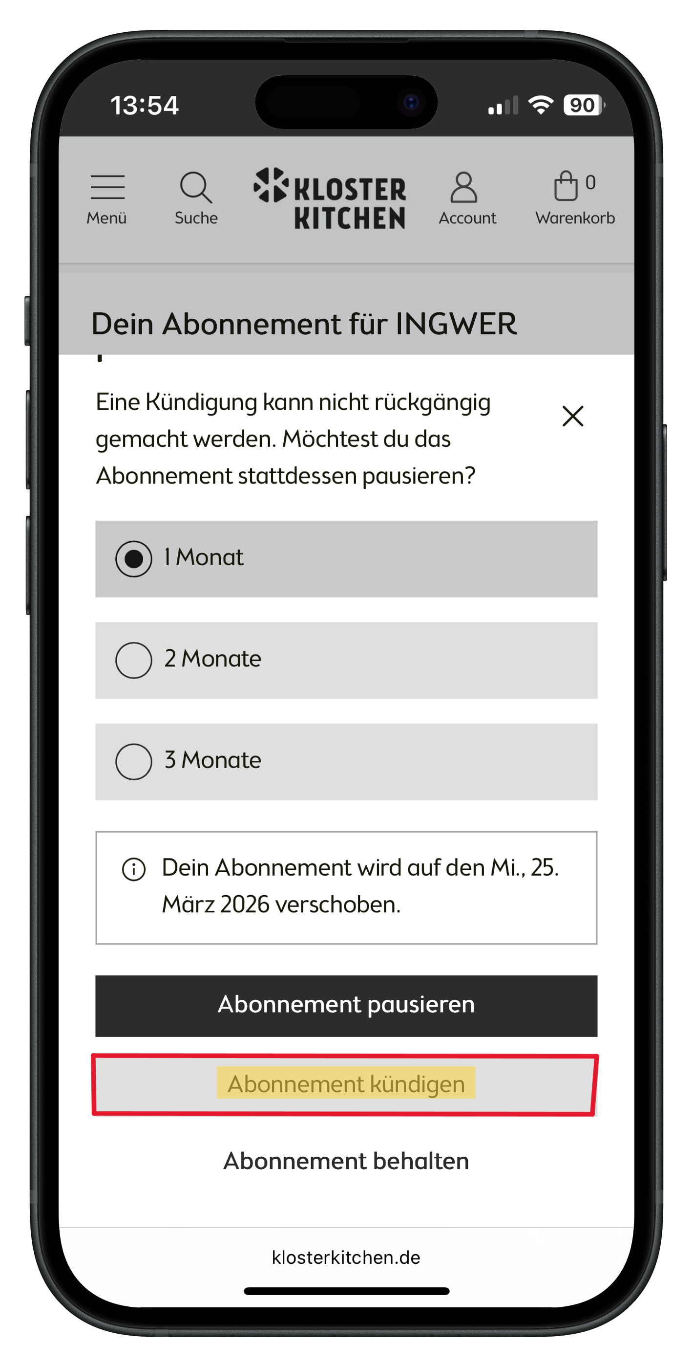 Klicke jetzt auf kündigen, hier kannst du dein Abo pausieren oder auch kündigen