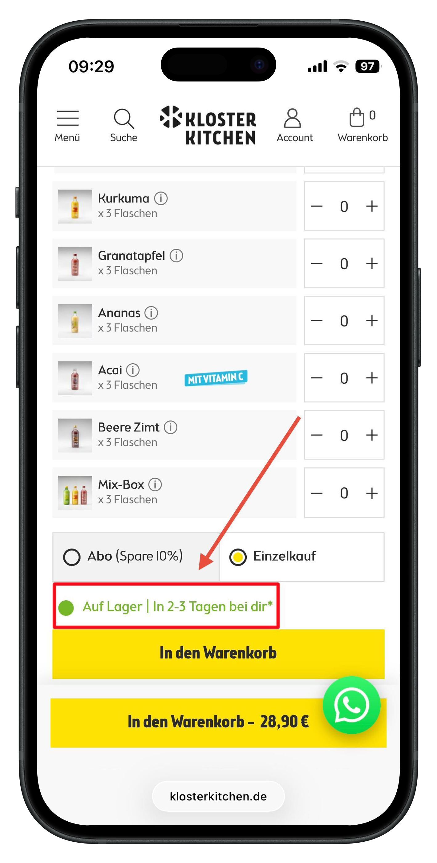 Hast du Artikel mit unterschiedlichen Lieferzeiten bestellt, versenden wir die Ware in einer gemeinsamen Sendung, sofern wir keine abweichenden Vereinbarungen mit dir getroffen haben. Die Lieferzeit bestimmt sich in diesem Fall nach dem Artikel mit der längsten Lieferzeit, den du bestellt hast.