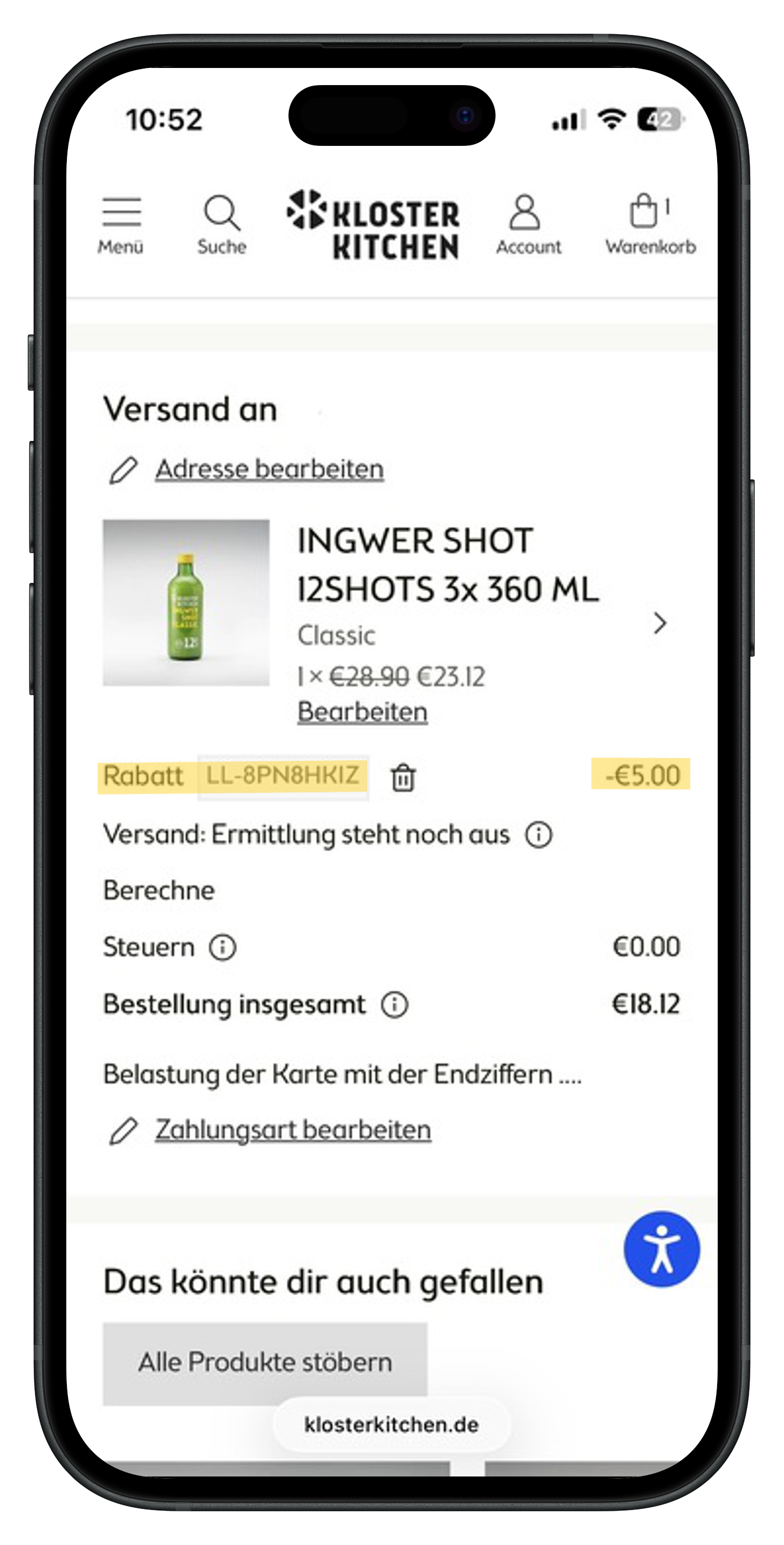Unter "Mein Account" findest du Gutscheine für die normale Bestellung und weiter unten für die Abo Bestellungen. Wenn du deinen Gutschein ausgewählt hast, musst du einmal wieder nach oben scrollen und auf Abos verwalten klicken.