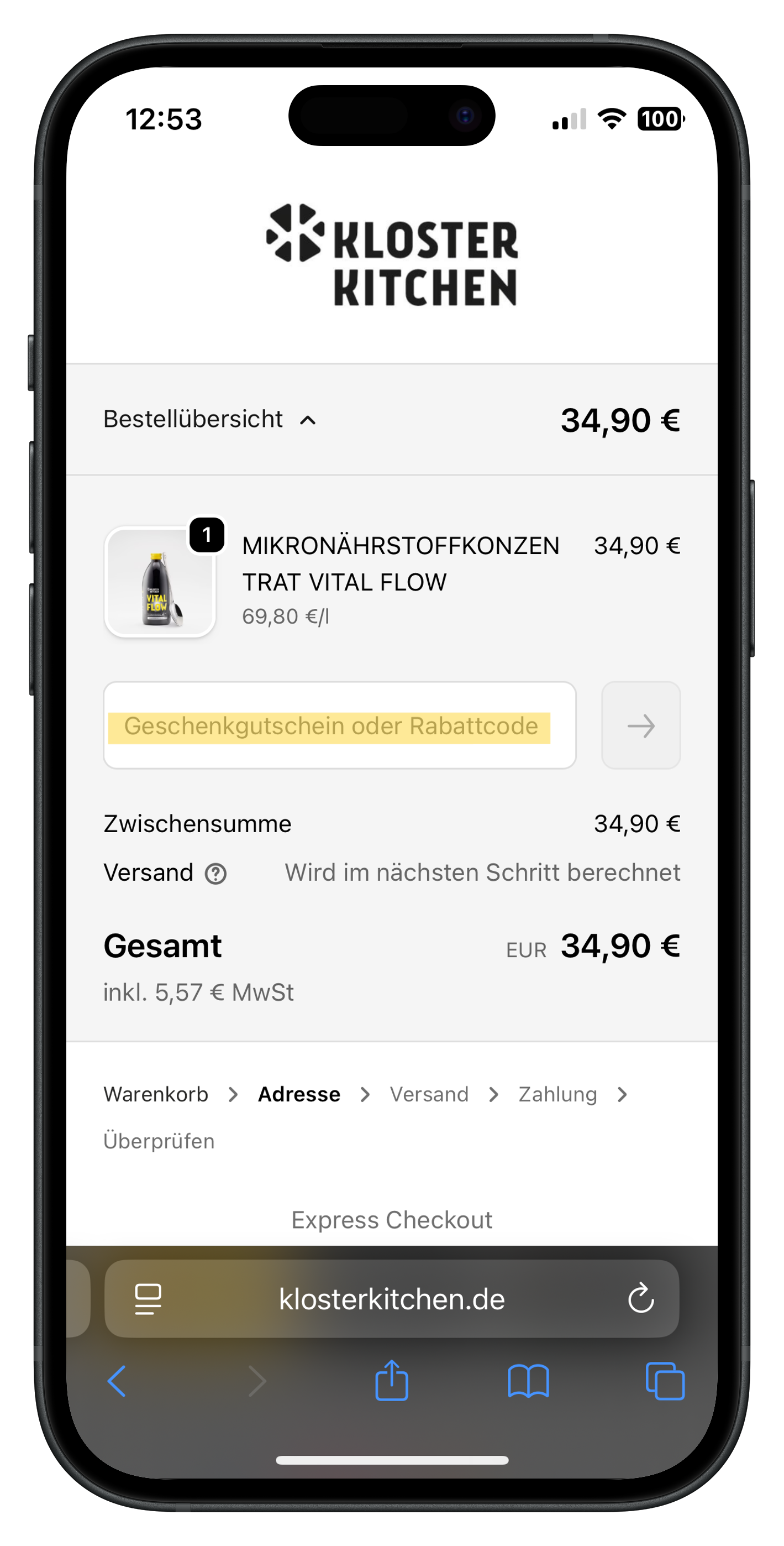 Im Feld "Geschenkkarte oder Rabattcode", kannst du deinen Code eingeben. Gegebenenfalls musst du dazu die Seite kurz aktualisieren. ´Dann wird der neue Endbetrag angezeigt.
