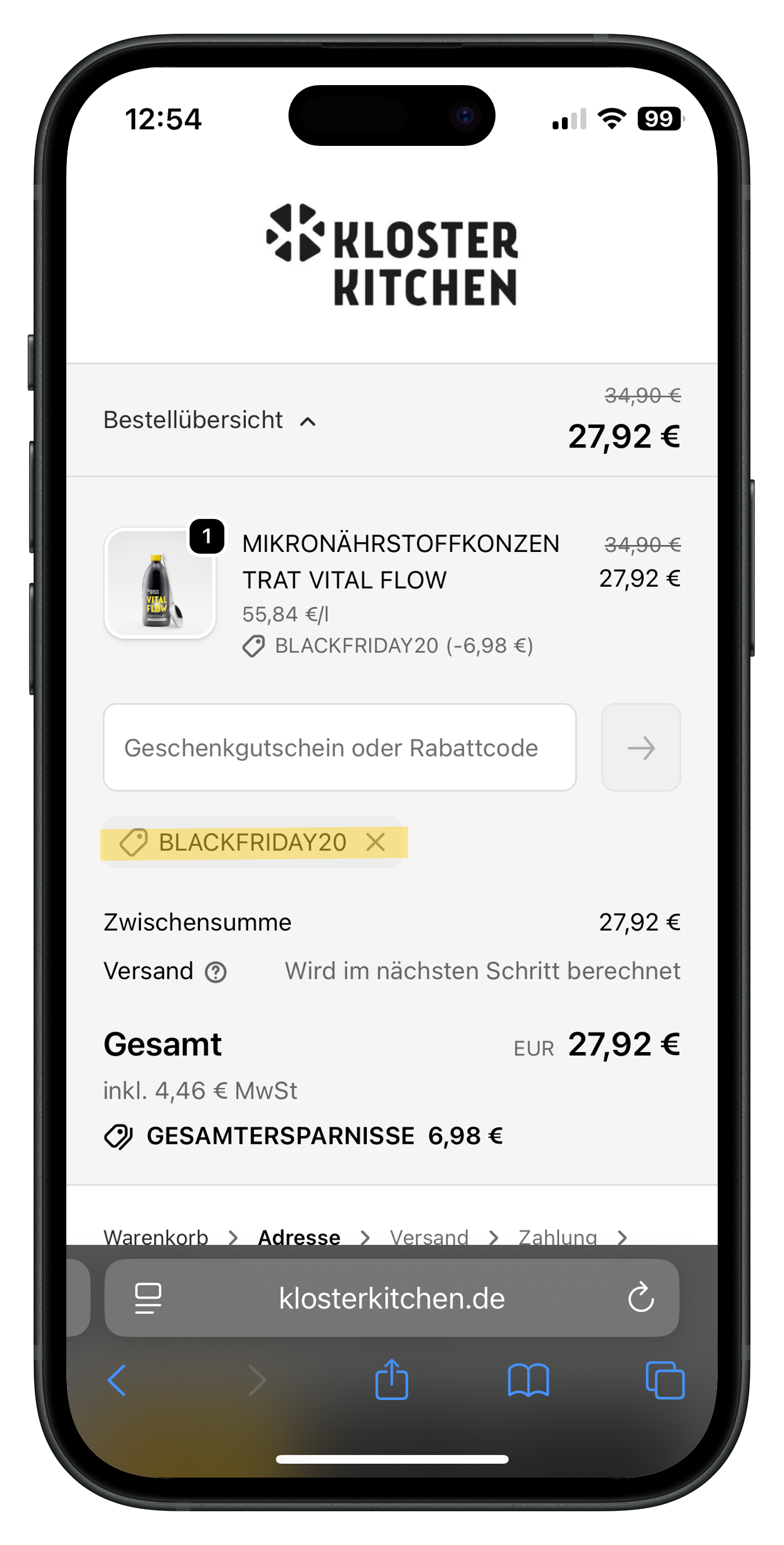 Tu peux saisir ton code dans le champ « Carte cadeau ou code de réduction ». Si nécessaire, tu devras actualiser la page. Le nouveau montant final s'affichera alors.