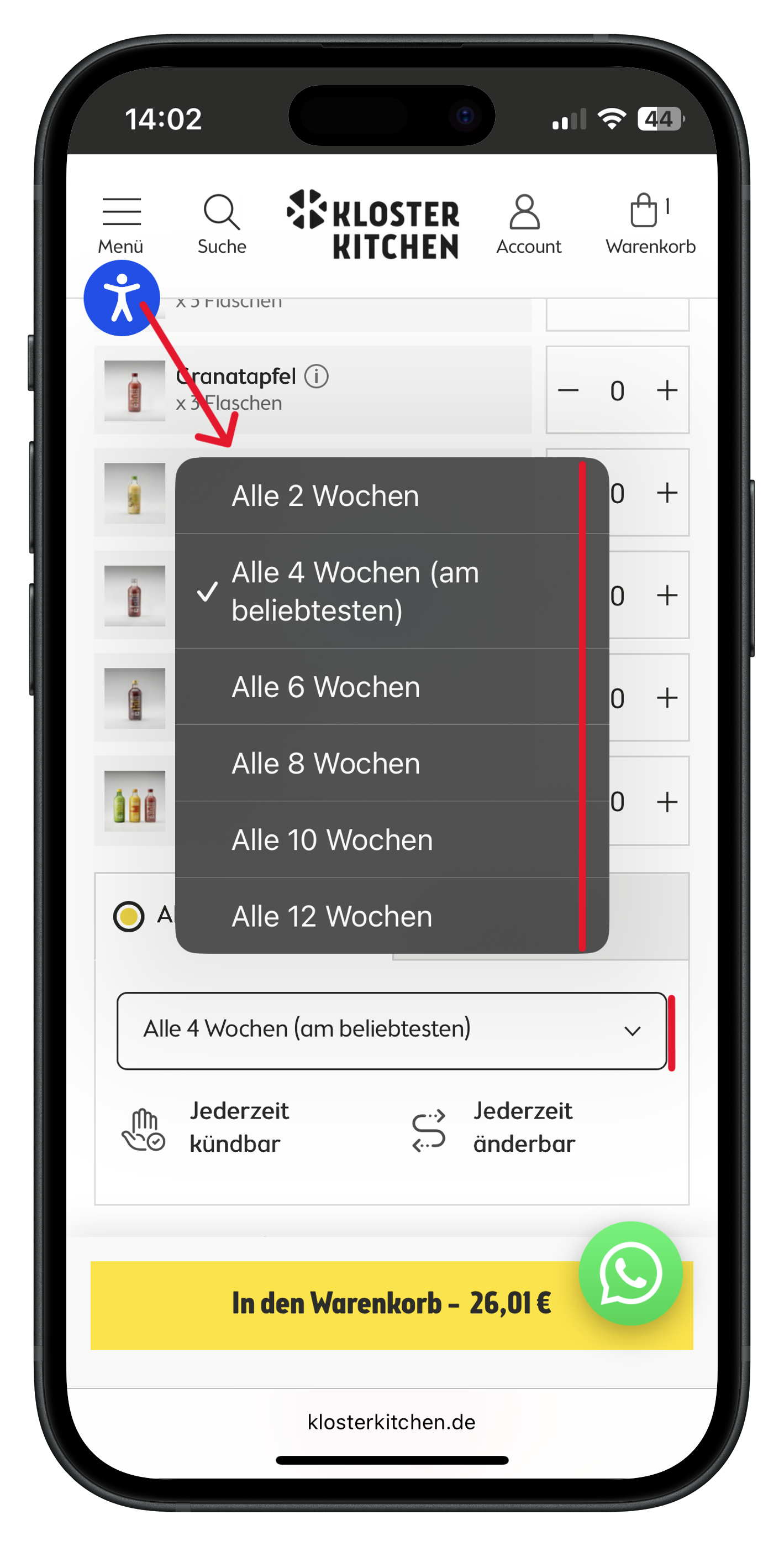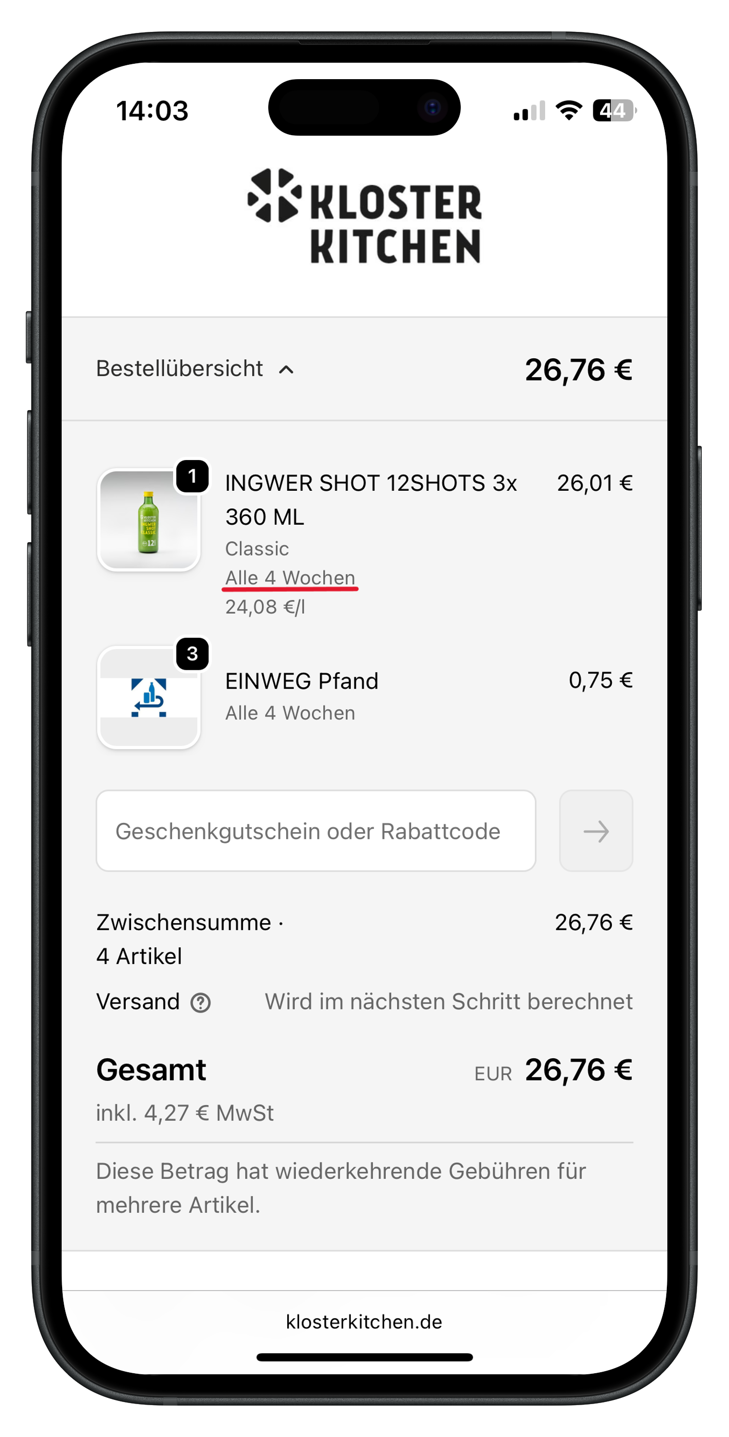 4. Clicca sul carrello, inserisci il tuo indirizzo e ricevi regolarmente i tuoi shot allo zenzero (ATTENZIONE: non tutti i metodi di pagamento sono disponibili per questa funzione, poiché i pagamenti devono essere effettuati regolarmente)